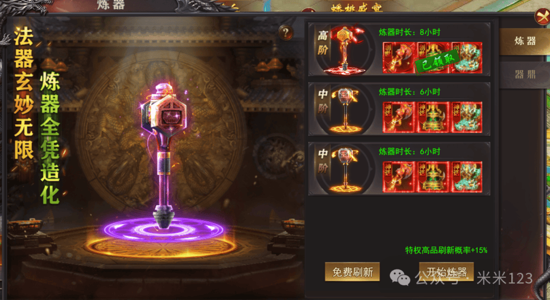 3.炼器品质:炼器分为初、中、高。概率刷新到高级炼器,有概率炼制出极品装备。可以用钻石刷新炼制品质