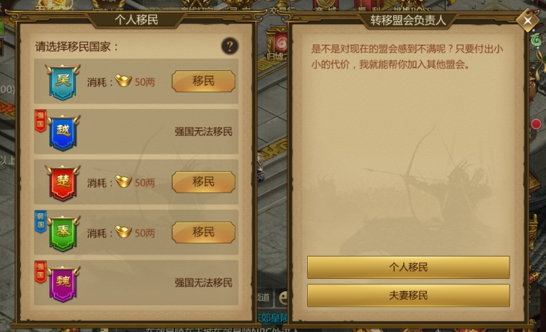 支付移民费用:个人移民需要支付50两金子,夫妻移民需要消耗100两金子,由发起者支付。