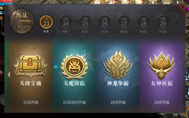 玩家可以在游戏界面右上角点击“历法大事件”按钮,查看当天或即将到来的活动安排。活动开启后,天外魔君会在野外随机地图刷新。