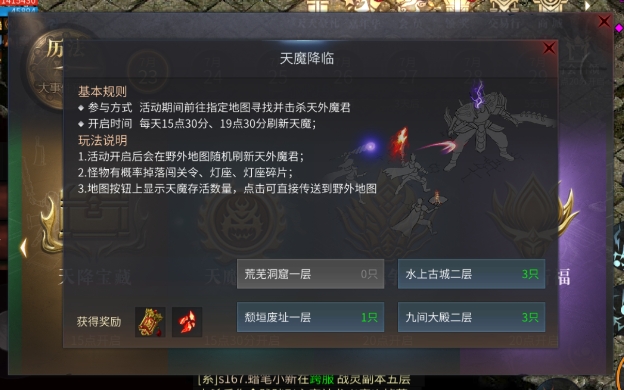 击杀 BOSS:玩家可以在活动地图按钮上查看天魔的存活数量,点击按钮可以直接传送至对应地图。击杀 BOSS 后,玩家有机会获得活动奖励。