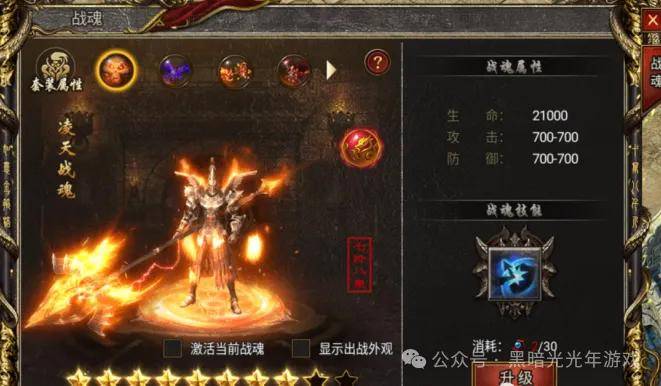 目前游戏中有七种战魂,战魂激活后为 0 阶 0 星,可使用战魂精元和战魂精魄提升战魂,每阶一共有10星,升满后可升级到下一阶。