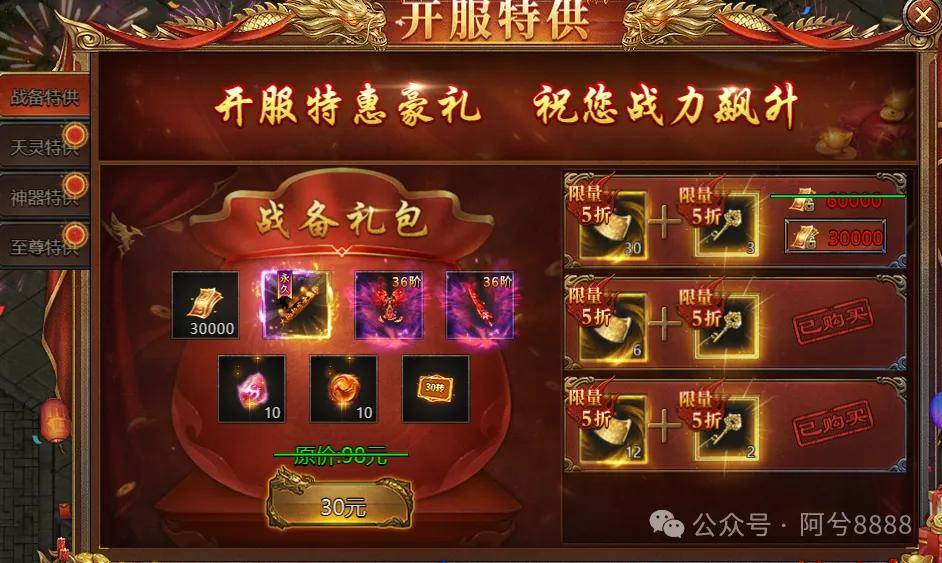 优先战备特供→完成转生→快速解锁高级玩法,入手天灵特供→提升修为→增强技能效果,获取神器特供→强化装备→提升实战能力。考虑至尊特供→为长期发展储备上古精华。四大特供礼包均为限时发售,错过开服时段后将无法再次获取。建议根据自身预算合理规划,优先确保战备和天灵两大基础礼包。关注阿兮8888专属游戏资讯,游戏富力游戏攻略