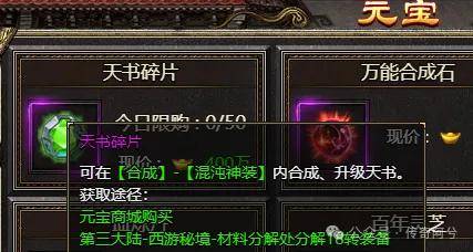 商城购买:最直接的获取方式,建议玩家在游戏中期打宝效率提升后,每日购买商城内的天书碎片,以稳定提升天书等级。
