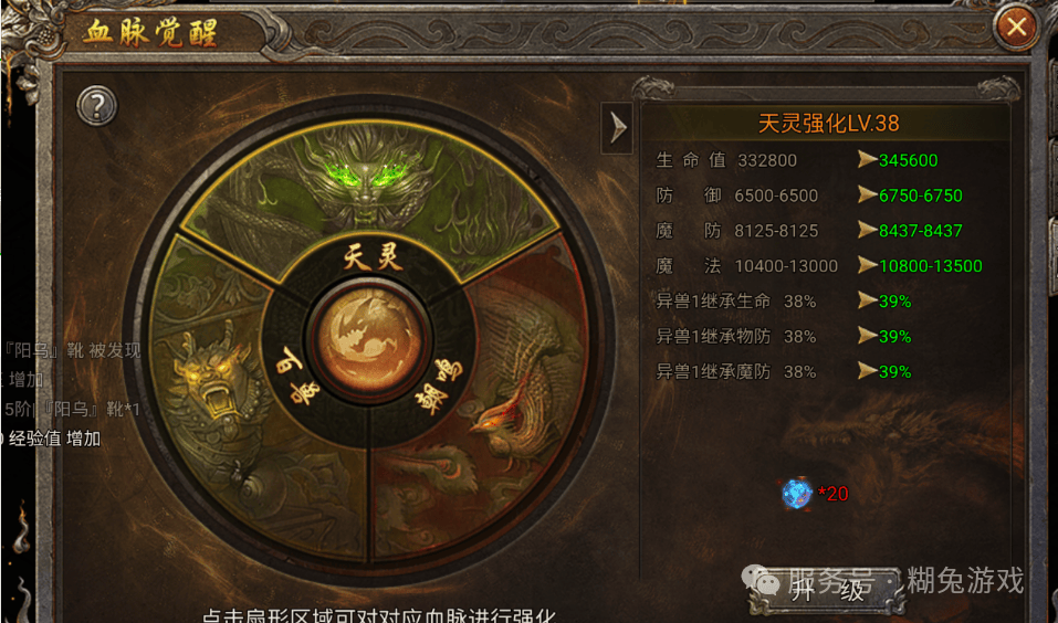 天灵血脉:可提高一号异兽的生命和防御属性,需要用到天灵精华,通过每日礼包和凶兽幻境一层打怪掉落;