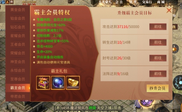 会员选择:从第二天开始,建议直接升级到永恒会员(掉宝率+45%,可自动回收)或至尊会员(掉宝率+50%,2倍切割,减伤15%)。这些会员特权可以显著提升游戏体验和效率。
