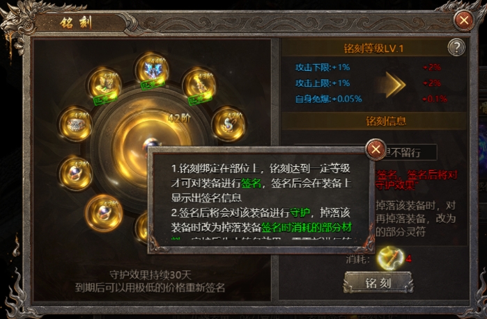 2、铭刻守护:签名后将会对该装备进行守护,掉落该装备时改为掉落装备签名时消耗的部分材料,守护后失去签名效果,需重新进行签名;