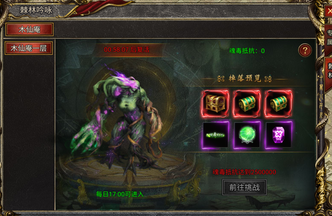 1、木仙庵每层进入条件跟自身魂毒抵抗属性数值相关,层数越高奖励越好