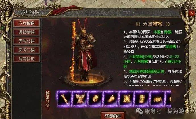 六耳猕猴领域分为两层:本服和跨服。跨服地图可通过本服地图传送进入。跨服地图每天14点至24点开放。本服和跨服领域内各有5只六耳猕猴分身和1只六耳猕猴全爆BOSS。击杀BOSS可获得高星级万物装备,不同BOSS掉落不同部位的装备。