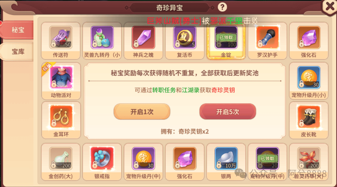 江湖秘宝是游戏中获取稀有道具的核心玩法之一,通过抽取秘宝库,玩家可以获得丰厚奖励。