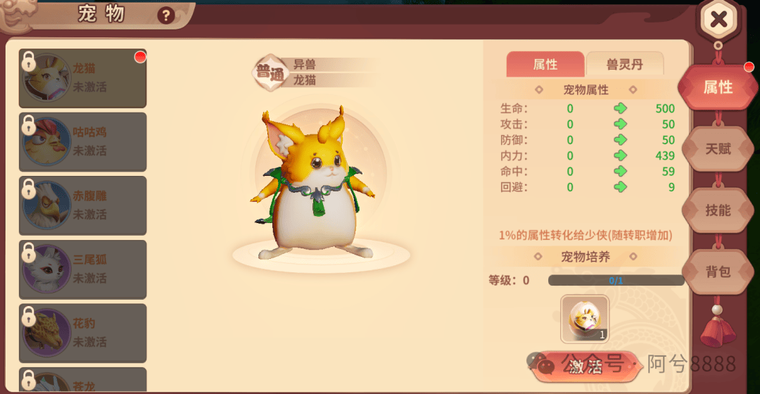 天赋为宠物天生,转职时随机刷新,锁定橙色天赋可大幅提升暴击、吸血等稀有词条;技能则靠技能书升级,每升5级额外获得特效,如“连击+1”“群攻溅射”。优先给主宠吃高阶书,收益最高。