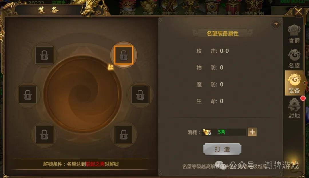 名望装备系统需要满足:名望等级达到50级自动开启第一个装备栏,每提升20级名望等级解锁新的装备栏位,最多可开启6个名望装备栏,装备属性随名望等级提升而增强。
