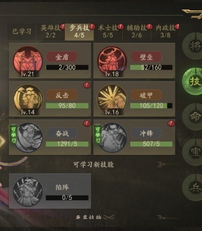 不学冲锋陷阵:步兵不学冲锋陷阵,优先选择防御技能。
