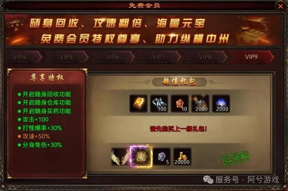 VIP9:兽化、100麻护特戒碎片、10仓库拓展卷、圣羽之辉、全屏拾取(15分钟)、5背包拓展符,终极技能与效率特权完美收官。