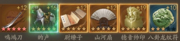 装备推荐:鸣鸿刀 + 赤兔马 / 武侯车 + 三十六策 + 幽谷香炉 + 德印。