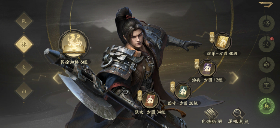 兵法配置:治兵 - 方圆,强攻 - 方圆,固守 - 方圆。强攻 - 鬼谷,固守 - 鬼谷,治兵 - 鬼谷。全套方圆。