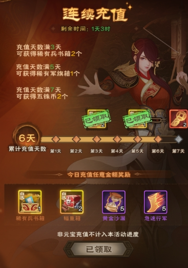 充值节奏:前七天累计氪金328元,确保每天六元的连续充值,第八天可领取21000元宝。