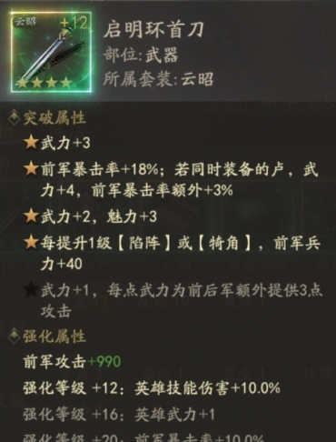 这些属性特别适合张辽、赵云、孙策、吕布、刘备、贾诩、马超等武将,尤其是前军输出型武将。平民玩家即使买不起龙雀刀的关羽也能使用。云昭刀和云昭马的泛用性非常高,是平民玩家的福音。