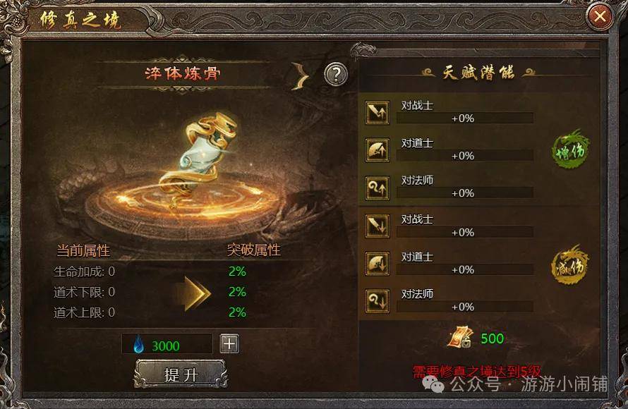 玩家首先需要收集足够的灵力,并将修真之境提升至5级。修真之境是角色成长的关键系统,通过日常任务、副本挑战和活动奖励均可获得灵力。当修真之境达到5级后,天赋系统自动激活,玩家即可开始分配天赋点,获得强大的属性加成。