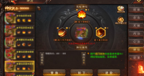 4.神纹槽位开启后,可进行穿戴神纹,攻击类型的神纹只能本职业进行穿戴
