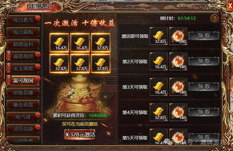 在活动结束前成功激活直购投资计划,即可开启您的财富之门。从激活当日起,每天登录游戏都能领取丰厚奖励,稳定收益日日进账。这份持续性的回报将伴您征战四方,直到领完全部奖励后,入口才会消失。日积月累,小投入终将汇聚成巨额财富,让您的资源储备远超常人。