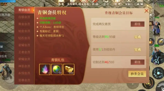 会员二开始,就有剑甲BOSS了。这边BOSS就爆武器装备锻造书的,同时具备反伤能力,你打怪,自己还有反扣血,因此建议至少要有2星神器套装支撑才好刷。