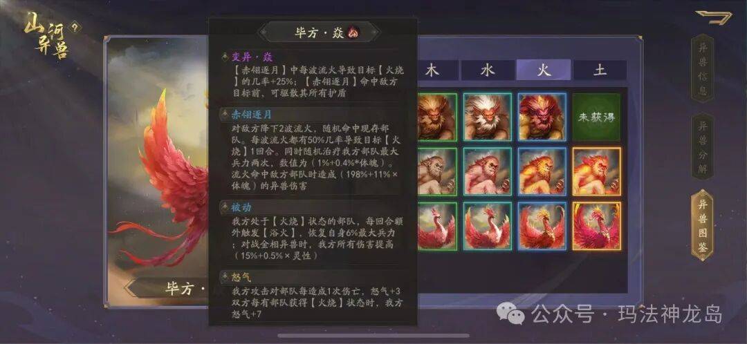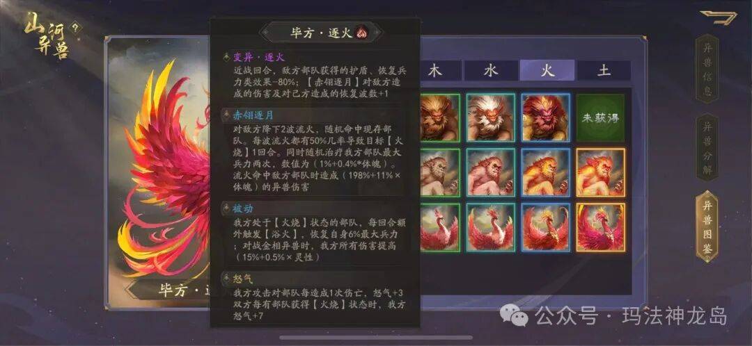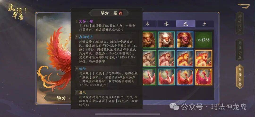浴火额外恢复百分之五的最大兵力,对战金属性异兽时增加百分之二十免伤