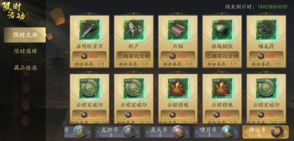 示例: 假设你需要满星云昭刀和云昭马。每次只抽2万元宝,前5次没出,只有8000神运币和1000个突破印(突破印随机的可能多也可能少)。自己计算S3赛季买刀和马要花8000神运币,和200个突破印要花4000神运币,不够。需要补4000神运币。第6次就需要去抽够神运币(期间会出突破印或者所需要的云昭装备),根据情况去抽。