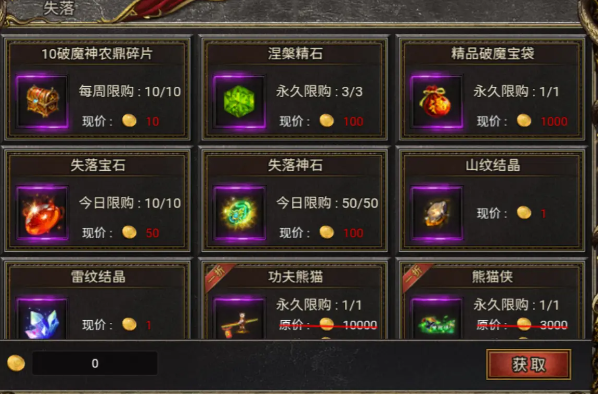 失落宝石:能兑换失落宝石,每天限购10次,每次消耗50失落币,失落宝石可前往失落大陆的舍利尊王佛锻造处锻造神装,让玩家获得强大的装备,提升角色属性和战斗力。
