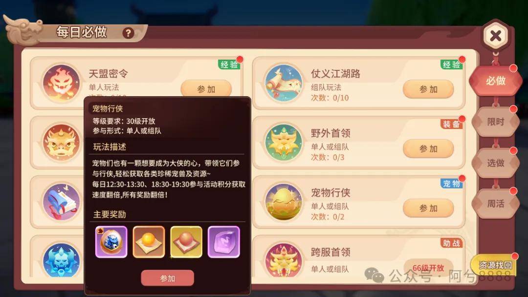当角色等级达到30级后,即可通过游戏内的“每日必做”界面找到并参与宠物行侠活动。值得一提的是,活动虽全天开放,但每日的中午12:30-13:30与晚上18:30-19:30为特殊时段,在此期间参与可获得双倍奖励,效率大增,切勿错过。