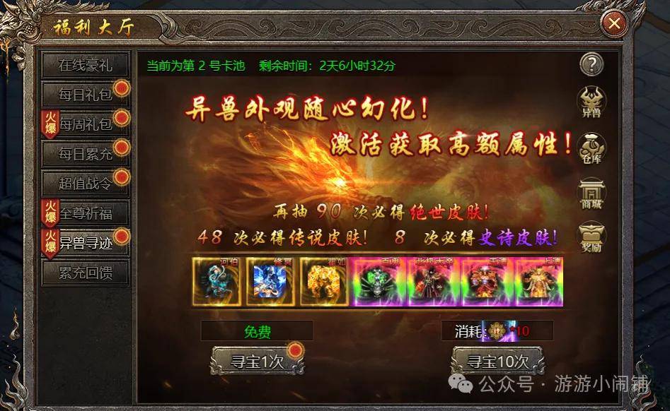 在破天传奇折扣包服山海经之名剑录异兽传奇游戏中,修冥残灵的主要作用是用来激活异兽修冥外观,玩家只需要收集指定数量后可在异兽-幻化界界面中激活异兽修冥。想要获取修冥残灵玩家们可以在异兽寻迹活动中寻宝获取,当然有实力的玩家也可以通过异兽商城购买获取哦!