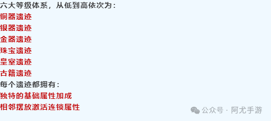 通过升级遗迹等级逐步解锁,每次升级都能获得属性加成。
