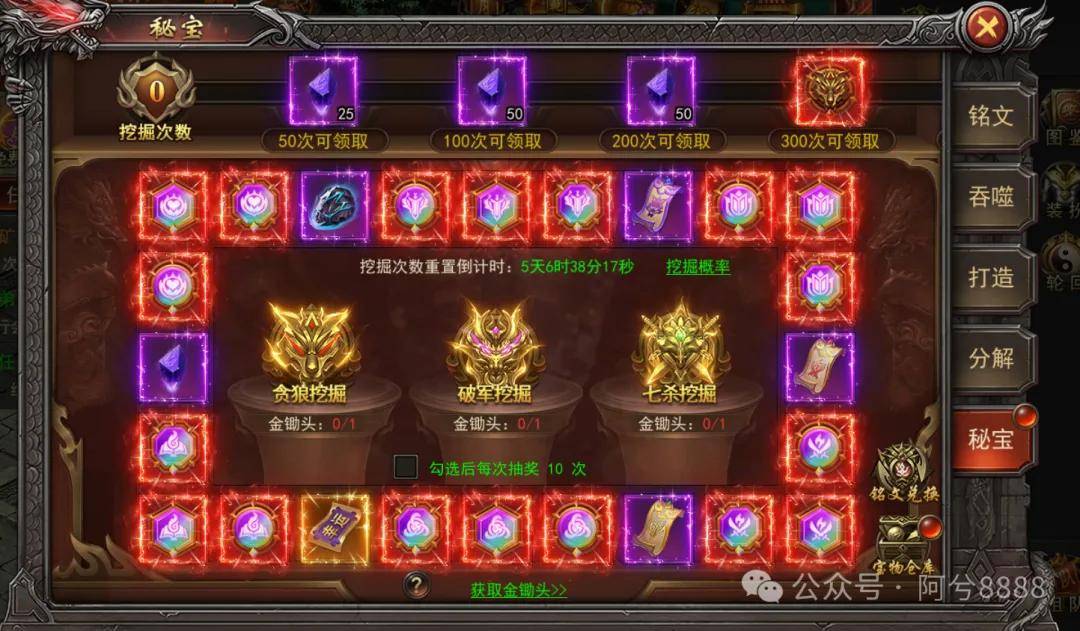 开天西游秘宝活动中挖掘贪狼秘宝,可获得贪狼铭文或贪狼合成材料,挖掘破军秘宝,可能获得贪狼铭文,破军铭文以及合成材料,挖掘七杀秘宝,可能获得贪狼铭文,破军铭文,七杀铭文以及合成材料,挖掘达到一定的次数可以领取额外奖励,奖励每周重置,每天限购100个金锄头。