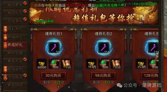 四圣封神八荒主宰斩魔无双折扣包服60天开放魂骨套装和魂骨BOSS,魂骨BOSS都带护盾,如果没有魂骨套装的话就打不破盾,所以这个养成好礼的活动要拿满,尽快的升级魂骨,这个活动礼包每日都刷新。魂骨装备升级材料至尊骨头,魂骨装备等阶越高,破盾值就越高,所以很多玩家发现到后面魂骨BOSS打不动,那就是破盾值不够,要继续升魂骨装备。