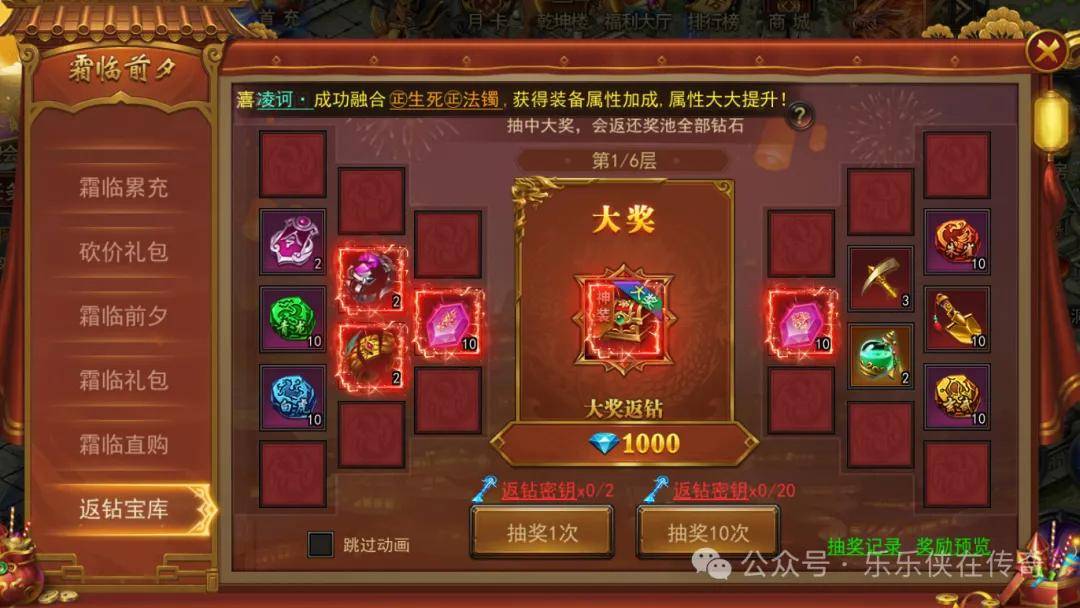 3、每次抽奖时,返钻奖池会中的钻石数量会增加,层数不同每次抽奖增加的数量不同