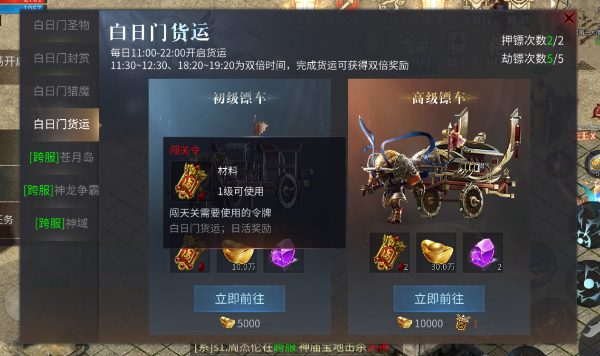 在白日门进行货运,若在双倍时间段押镖,可获得双倍的闯关令。双倍时间段通常是每天的特定时间段,建议玩家提前了解并利用这一时间段进行押镖,以获取更多的闯关令。