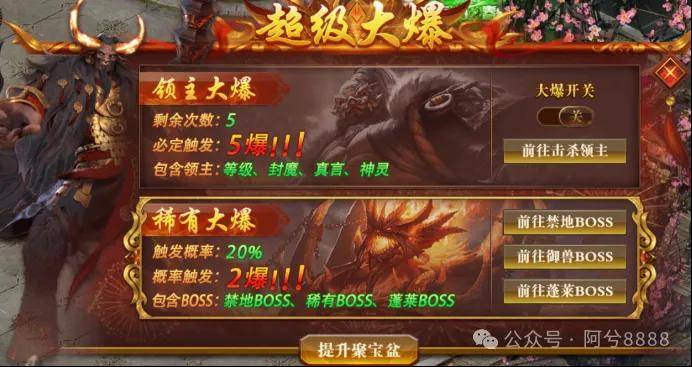 在线时间达标即可领取聚宝盆,激活可获得超级大爆和稀有大爆次数。使用聚宝盆碎片可提升聚宝盆等级,等级达标可解锁分解加成,提升大爆次数概率等效果。聚宝盆碎片可在商城或活动获取。