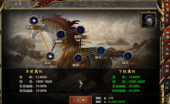 开服180天后,位于游戏右下角的【转生】-【命盘】处即刻查看命盘系统,玩家可以在这里升级命盘。