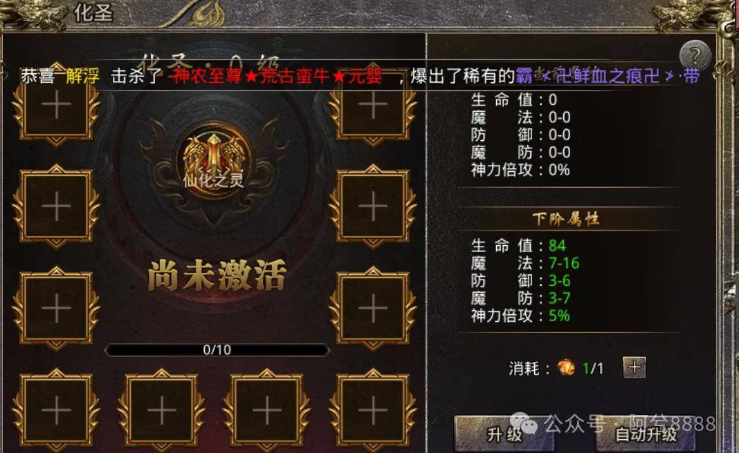 狼影传说怒火一刀月卡版化圣升级通过商城购买灵符道具升级灵符每日限购100次。也可以通过活动礼包购买,玩家们提升化圣等级可以进入石原的迷雾山脉击败怪物获取化圣装备提供强力属性--神力倍功!。神力倍功:100%可以提升攻魔道:1%生命值:1%物理防御:1%魔法防御:1%。