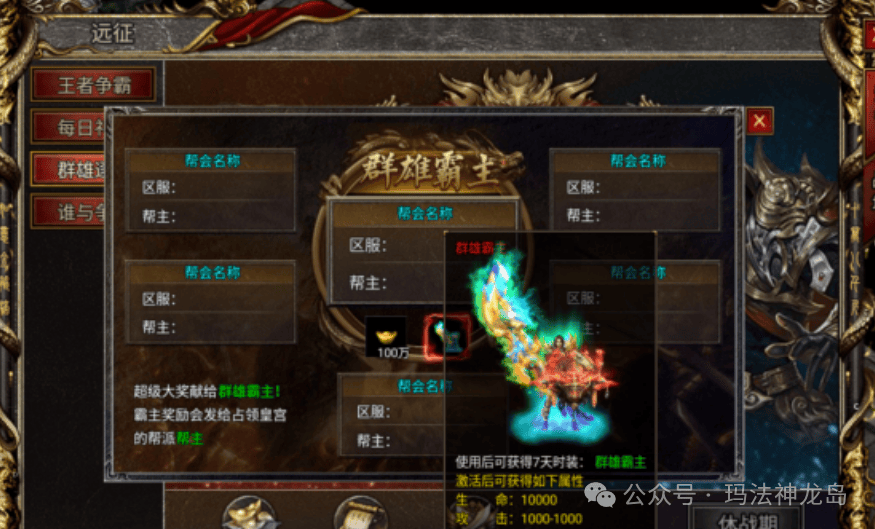开服30天之后,每周日晚的8点都是群雄逐鹿的时间,说白了就是跨服攻沙,一个行会必须要有5个超过250级的人在线才可以报名,否则不能报名,如果包服的玩家或者散人区里面人不够的玩家,可以找客服帮忙顶号上去凑人数,确保可以拿到沙。