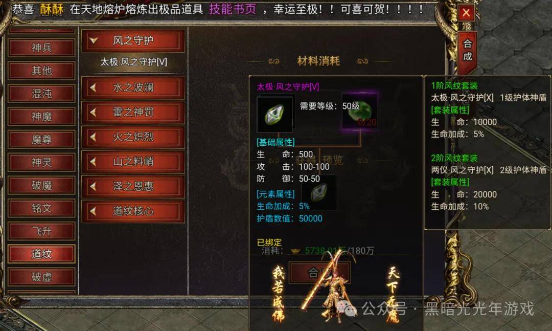 开服25天,且角色50级即可开放道纹系统。道纹共有风之守护、水之波澜、雷之神罚、火之烈焰、山之料峭和泽之恩惠六种道纹类型。每种道纹都拥有独特的属性和效果,按照前缀名不同,有太极、两仪、三才、四象、五行、六芒、七星、八卦、九宫、十方10种