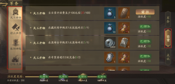 日常任务分为四个板块,每个板块都有不同的任务和奖励。