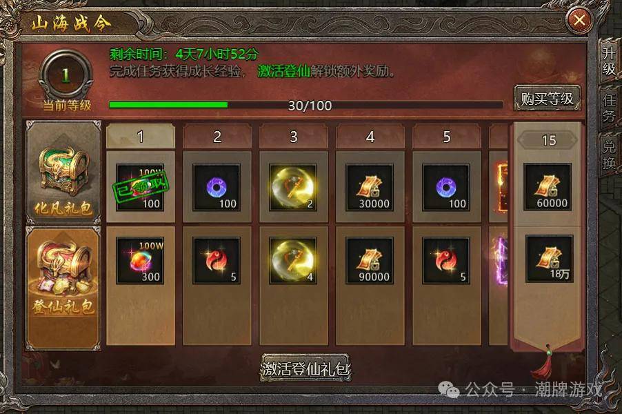 破天传奇山海经之名剑录山海战令68米激活登仙礼包,灵符奖励有50万,还有一套永久的时装,全属性加12%,最重要的是会给很多异兽材料,包括高品的炼妖石,高级的异兽魔晶,开通68的战令可以免费拿到的,而且山海战令不像其他游戏的战令那样动辄几十级才能拿满奖励最高只有15级,所以68米拿到这些奖励是超值的。