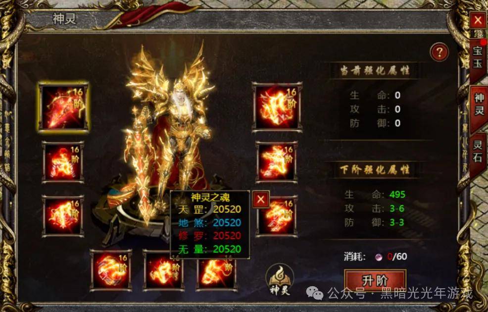 后续可通过【神灵精魄】升级神灵装备,提升装备属性,神灵装备可提升生命、攻击、防御的属性效果,集齐相应套装还能激活其套装效果。