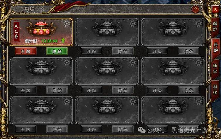 丹炉也是有不同等级,可根据丹炉火焰颜色进行区分,可使用【金精石】来提升丹炉等级,【金精石】可通过升级神火获得。