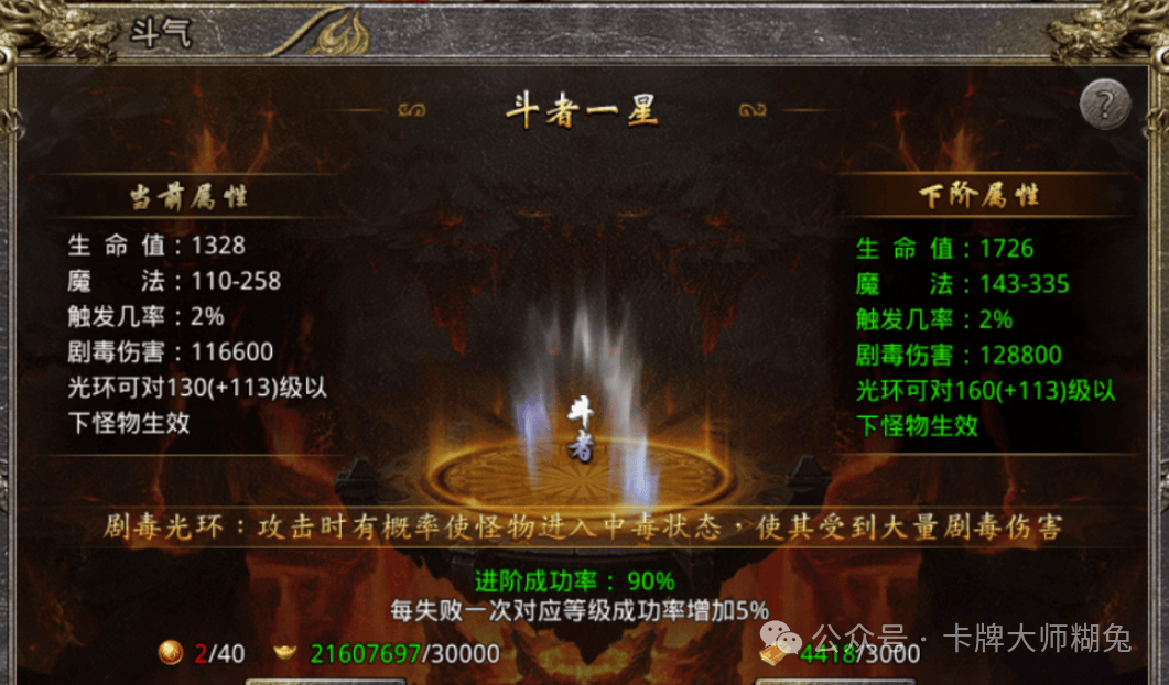 并且提升这个斗气等级,可以增加角色的生命值。魔法,触发几率,剧毒伤害,以及对多少级以下的怪物才可以生效。斗气可以通过消耗斗气丹和元宝升级,也可以直接使用灵符升级,升级不一定是百分之百成功的,但每失败一次对应等级的成功率就会增加5%。