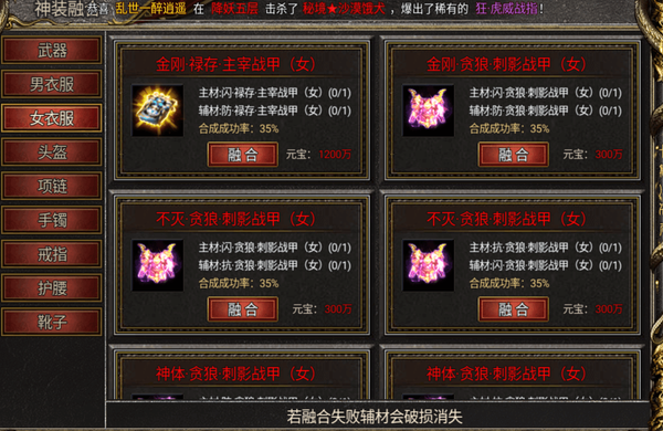 吸血属性的武器和项链爆率极低,融合时应将带吸血属性的装备作为主材,其他属性装备作为辅材,以防融合失败主材保留。
