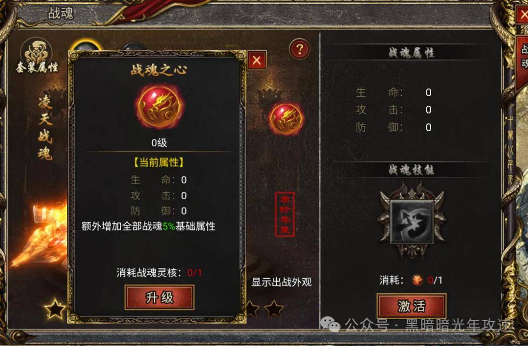 每个战魂都有独立的战魂之心,需要消耗战魂灵核来激活和升级。战魂加能按百分比提升所有战魂的基础属性。