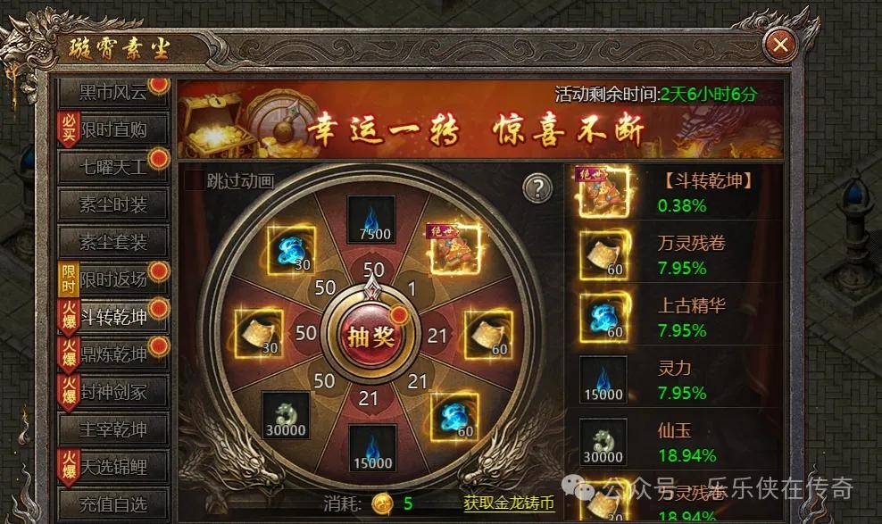 异兽传奇山海经之名剑录破天传奇折扣包服活动规则:转盘各格位对应道具均设有固定库存数量,每次抽奖必获得转盘展示道具之一。道具被抽取后,其库存数量实时扣减;当库存归零,该道具自动从奖池中移除,后续抽奖仅从剩余有库存道具中随机产生。当奖池内除某特定道具外其余道具库存均为0时,后续单次抽奖必中该剩余道具,确保所有道具100% 可获取。具体道具、数量及概率详见概率公示列表。