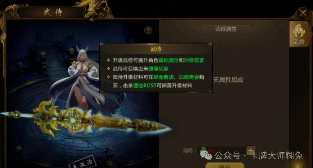 每次升级武侍,都会获得属性加成,包括:攻击力、防御力、生命值。玩家可以在游戏的【伙伴-武侍】功能中管理和升级武侍。通过消耗武侍魂魄结晶,玩家可以提升武侍的等级,解锁更强大的技能和属性加成。