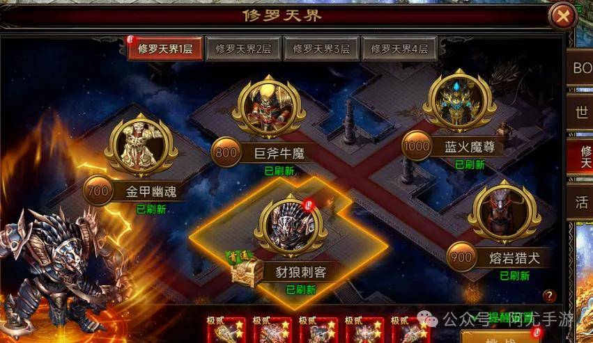 五层之后的地图需要首通上一层最后一只BOSS后才可以进入。修罗BOSS的掉落装备比普通地图BOSS掉落的更好,推荐每天优先打修罗BOSS。